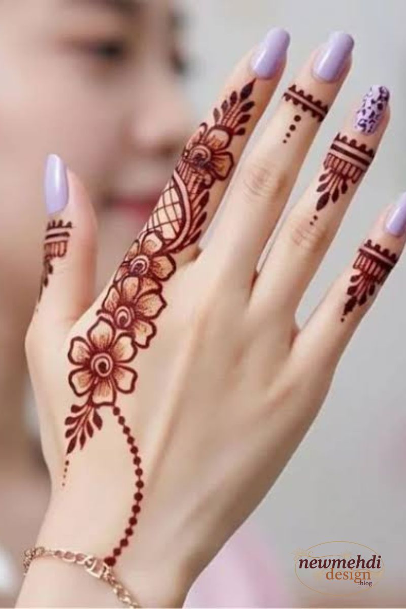 This Stylish Mehndi Design concept is versatile and quickly adaptable, making it possible to transform a Very Easy Mehndi Design into something that looks complex and high-fashion. You can link the cuff to a ring design on one finger using a single, fine chain of dots for added elegance.