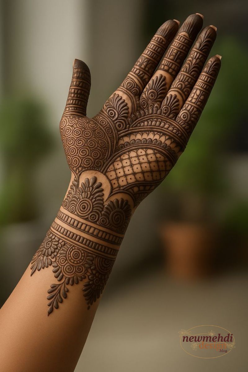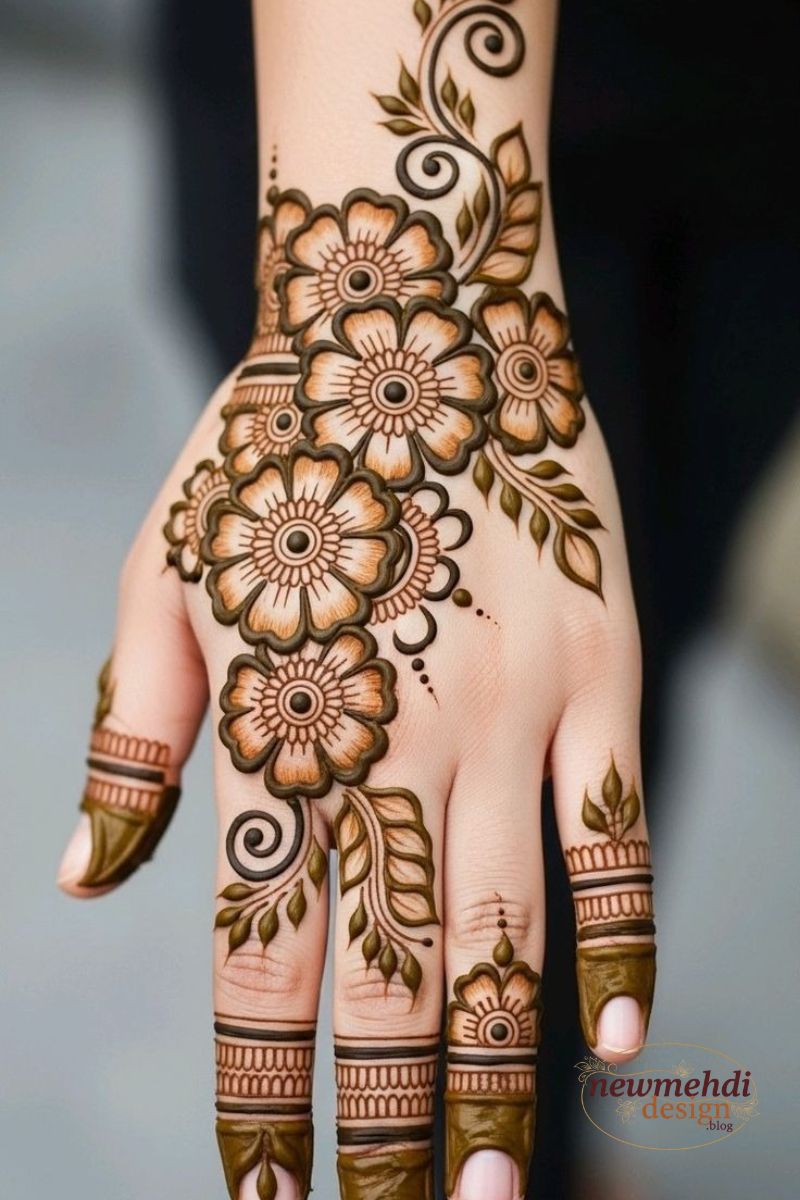 When you desire a sophisticated pattern without committing to the exhaustive detail of full-hand coverage, these designs offer the perfect solution you are seeking. The style focuses on maximizing the density of the bel while adding complex fill patterns within the larger flowers and geometric frames for an elevated look. These creations offer the visual richness of bridal henna but utilize strategic negative space to keep the overall look manageable and striking.