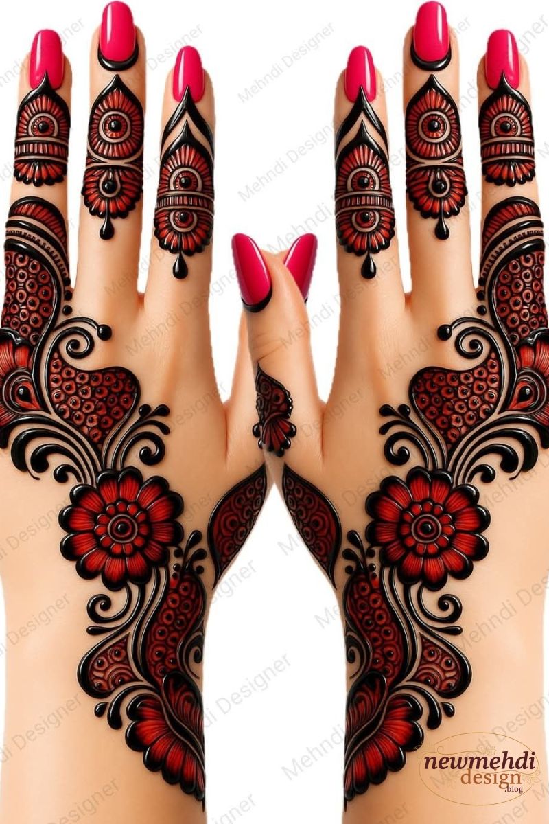 For truly ceremonial and magnificent occasions, the Royal Arabic Mehndi Design takes the signature Arabic boldness and amplifies it with luxurious, densely packed motifs and heavy outlining on all the fingers. This style incorporates complex elements like layered paisleys, although in an Arabic-fusion context, it often focuses more on spectacular geometry and shading than on traditional figurative work. It is designed to look rich and opulent.