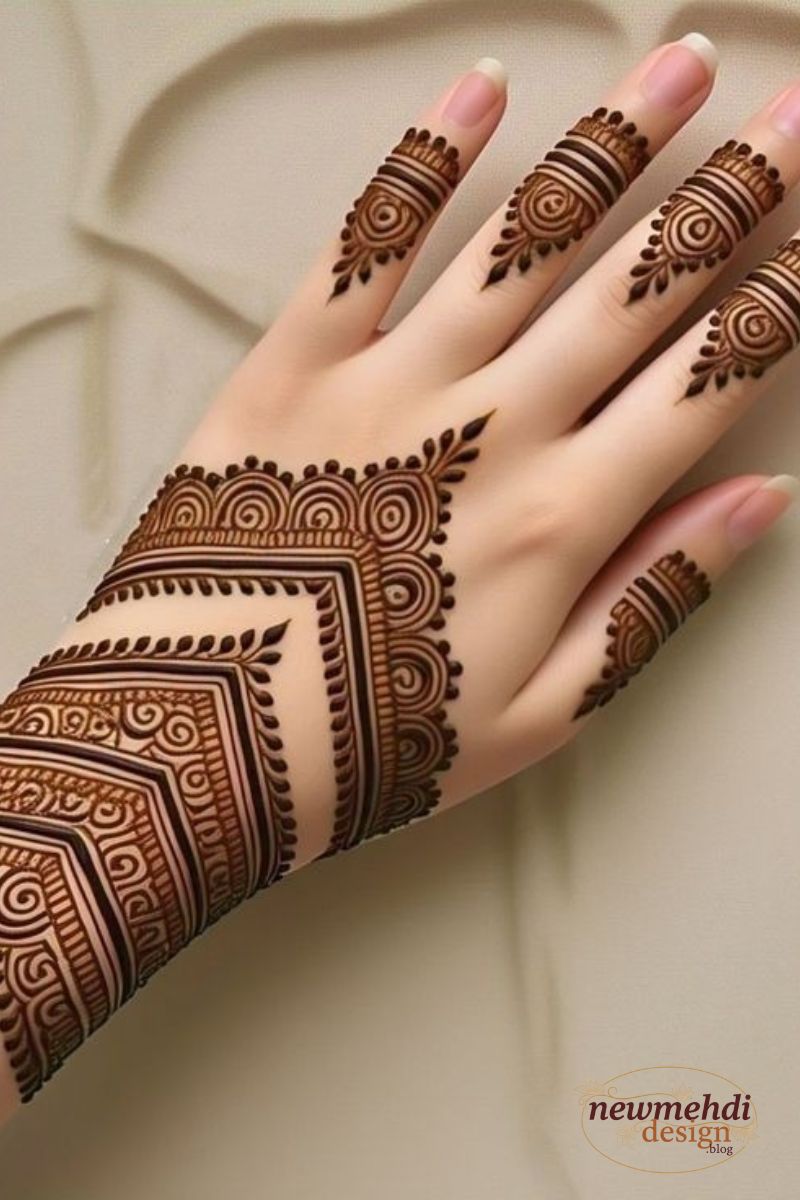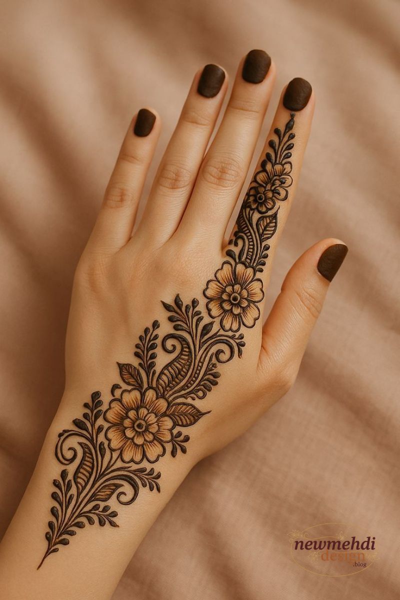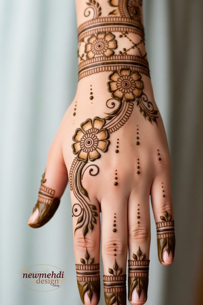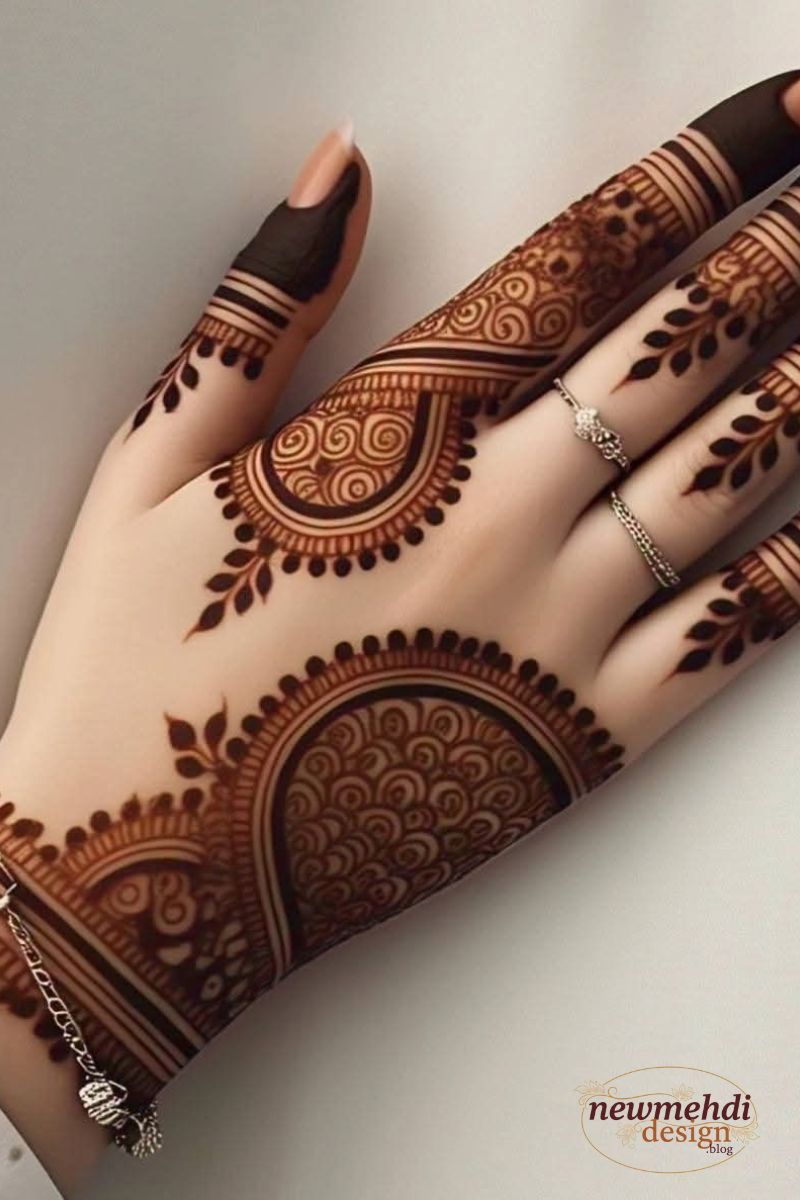 The back of the hand provides a beautiful canvas for designs that often deliberately mimic fine jewelry, focusing on a delightful visual flow from the forearm down to the fingers. Highly popular motifs include elaborate, stylized bracelet bands and gorgeous ornamental finger caps that create a truly dazzling and eye-catching effect. This area is ideal for showcasing Stylish Mehndi Design ideas because it is so frequently visible.