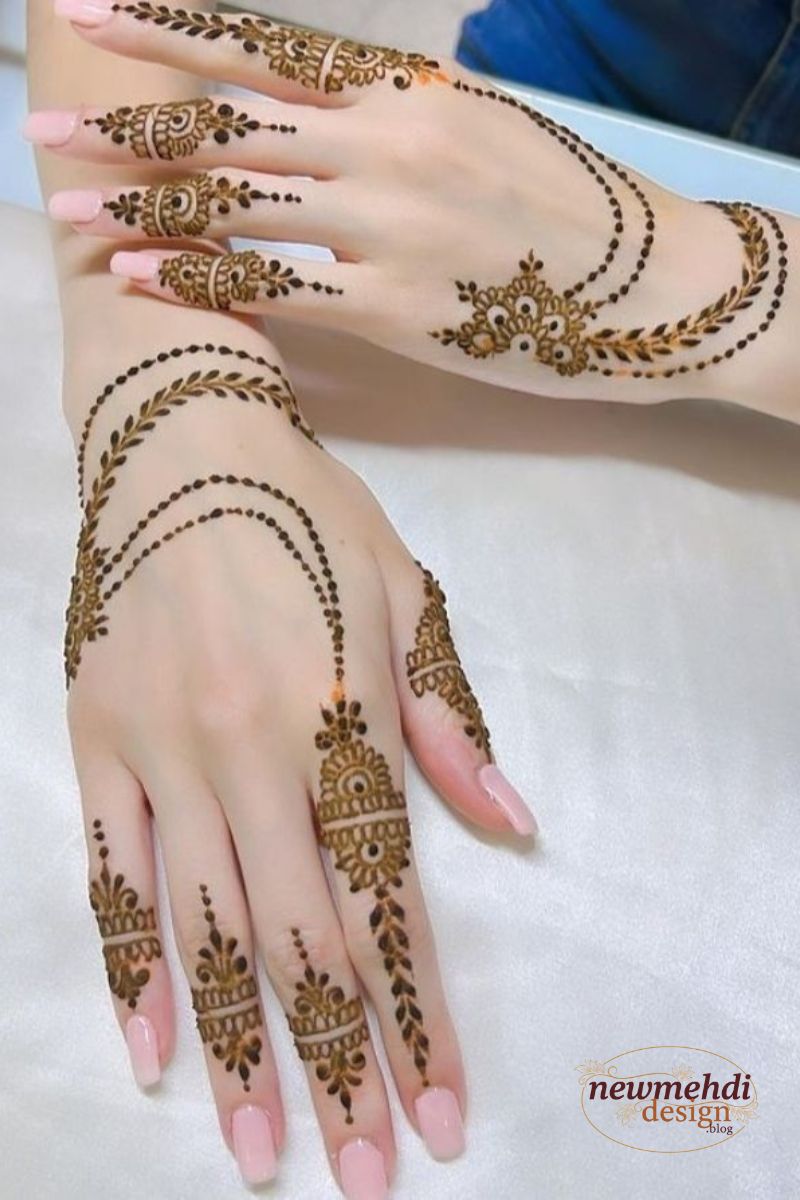 These Latest Arabic Mehndi Design patterns often integrate modern jewelry concepts, such as rings connected by delicate chains, moving far beyond simple traditional applications. The focus is on wearable art that acts as a stunning accessory, giving you a fresh, contemporary aesthetic.