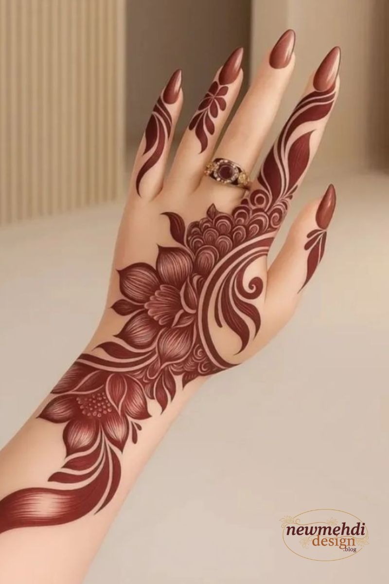 The Lotus Motif Front Hand Mehndi Design is a favourite because it is pretty simple to execute whilst still conveying deep symbolic which means and vast visual enchantment. It works wonderfully as a Half Hand Arabic Design or as the primary pattern for a minimalist wedding ceremony birthday party.